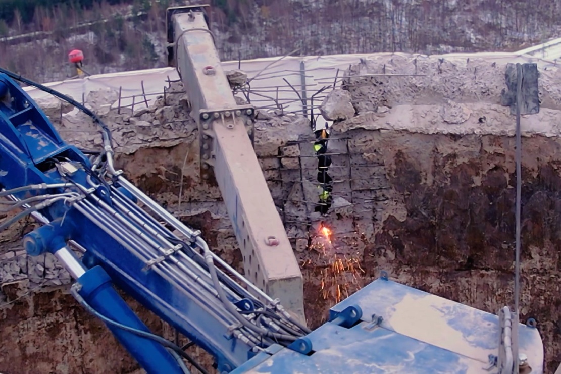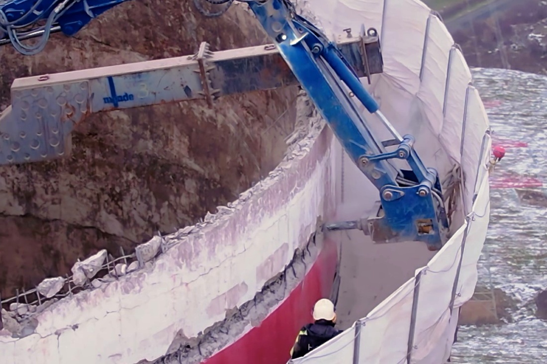I když speciální bourací bagr byl do vnitřní koruny komína usazen zhruba v polovině roku 2025, vlastní demolice začala přípravami na ni a výběrem zhotovitele už o více jak rok dříve. „Jako první bylo nutné odstranit, ještě bez použití bagru vnitřní cihlovou vyzdívku a celkově ho vyčistit od všeho, co by mohlo demolici zkomplikovat. Teprve pak se zakously jeho čelisti do okrajů vnějšího pláště. Kusy železobetonu jsou shazovány do vnitřních prostor komína, odkud jsou následně etapovitě vyváženy, vzorkovány a v případě kladných výsledků využity pro dorovnání plochy po Elektrárně Prunéřov 1.