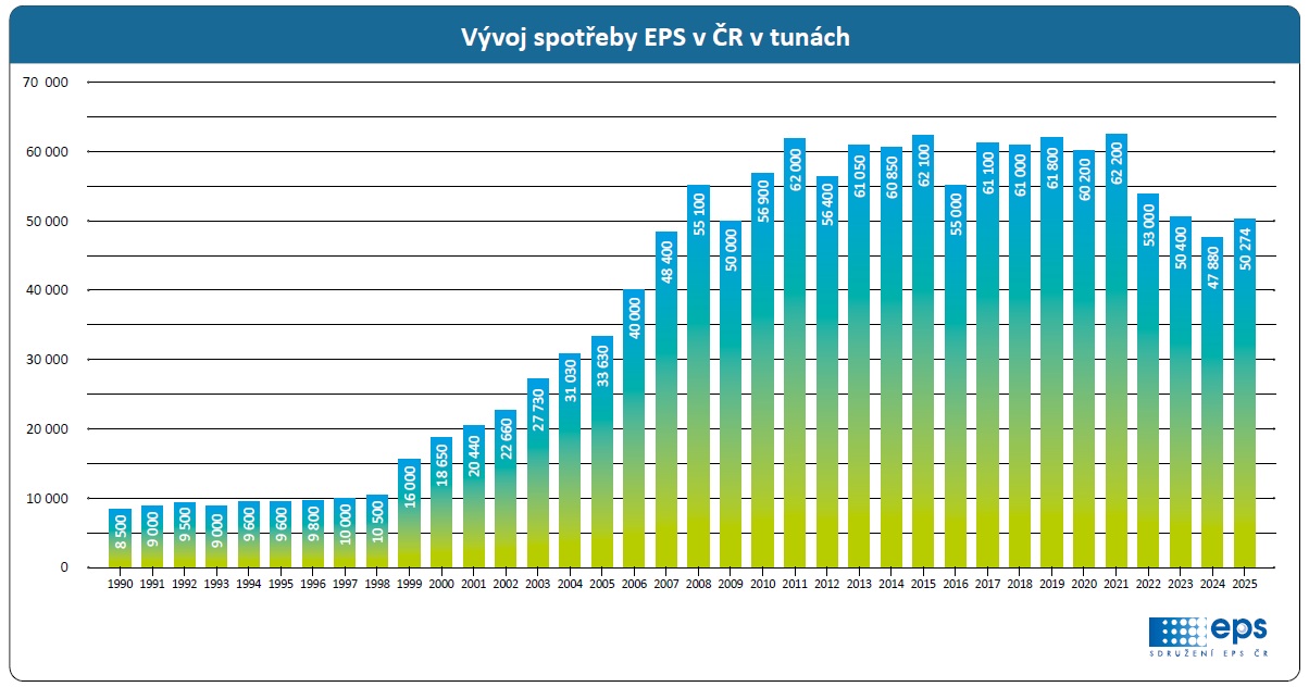Po třech letech poklesu se trh s pěnovým polystyrenem v Česku vrací k růstu. Sdružení výrobců polystyrenu eviduje za rok 2025 meziroční nárůst spotřeby přibližně o 5 % na 50 274 tun a pro letošek očekává pokračování tohoto trendu. Vedle oživení trhu dochází i k dlouhodobé změně standardu zateplování – nejčastější tloušťky izolací se posunuly ze 100 mm na 160-200 mm. Klíčovou roli v následujících letech sehraje obnova zastaralého bytového fondu, změny ve stavební legislativě, implementace evropské směrnice EPBD a rostoucí důraz na uhlíkovou stopu stavebních materiálů. Pozitivním signálem pro obor je také posun v oblasti požárních norem, kde výsledky odborných analýz vyznívají ve prospěch širšího využití pěnového polystyrenu.