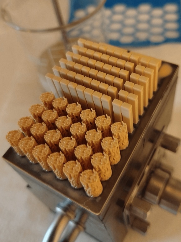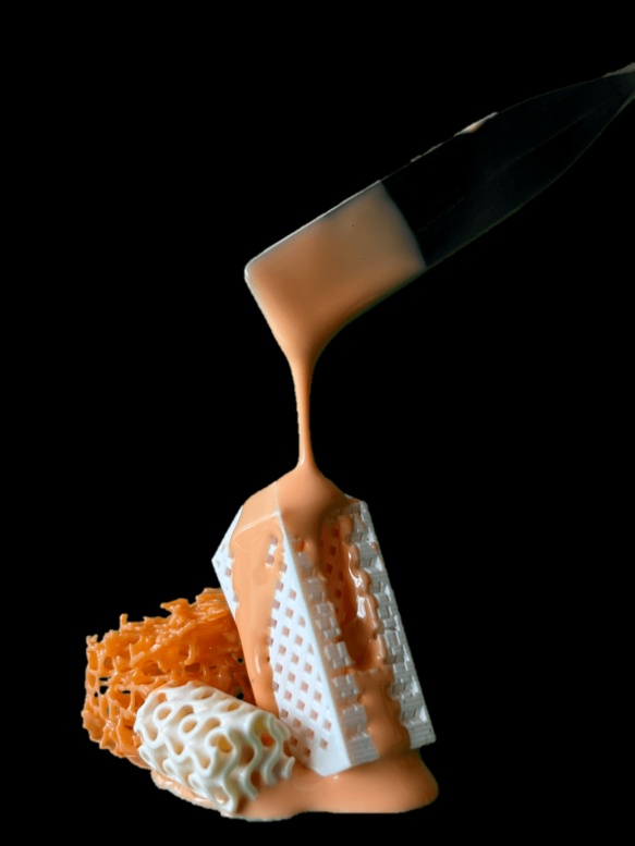 Jedním z nejběžnějších způsobů, jak vyrobit keramický 3D výtisk, je využití technologie binder jetting, při kterém se objekty vytvářejí vrstvu po vrstvě selektivním nanášením tekutého pojiva na lože z prášku, typicky z oxidu hlinitého. Pojivo pak drží práškové částice pohromadě a vytváří pevnou strukturu. Ale pro pochopení toho, na čem tým 4Slurries pracuje, je třeba představit si technologii zcela jinou - takovou, která využívá principu fotopolymerizace, tedy spojování a vytvrzování materiálu za pomoci působení světla o vlnové délce například 465 nm (modré světlo). Jedna z metod tisku s využitím fotocitlivých materiálů se nazývá DLP (digital light processing) a spočívá v použití digitální projekce světla k vytvrzování celé jedné vrstvy tisknutého objektu najednou. V rámci zpracování keramických materiálů se v takovém případě k tisku využívá fotocitlivé suspenze medové konzistence, v níž je obsažen jak vlastní keramický prášek (například oxid hlinitý či zirkoničitý), tak i pojivo v podobě různých (nejen) monomerů které funguje jako lepidlo.