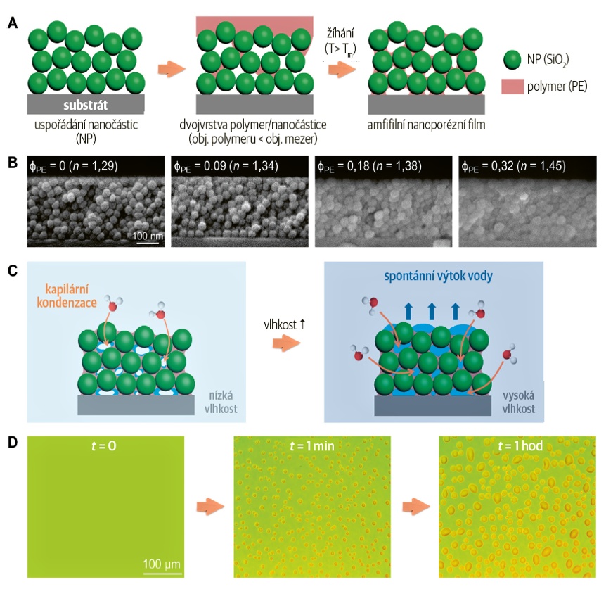 Náčrt makroskopické tvorby vodních kapiček na amfifilních nanoporézních PINF: Schematické znázornění procesu výroby filmu technikou CaRI (A);