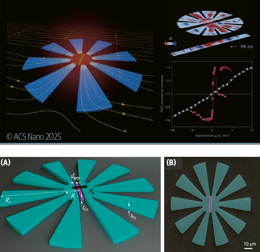Schematické znázornění typického magnetického metapovrchu použitého pro koncentraci magnetického pole s uvedením hlavních geometrických parametrů a orientace aplikovaného magnetického pole (A); SEM snímek skutečného zařízení v falešných barvách s 10 okvětními lístky, nulovou mezerou, Ri = 10 μm, Ri = 10 μm a R0 = 50 μm (B) © ACS Nano 2025