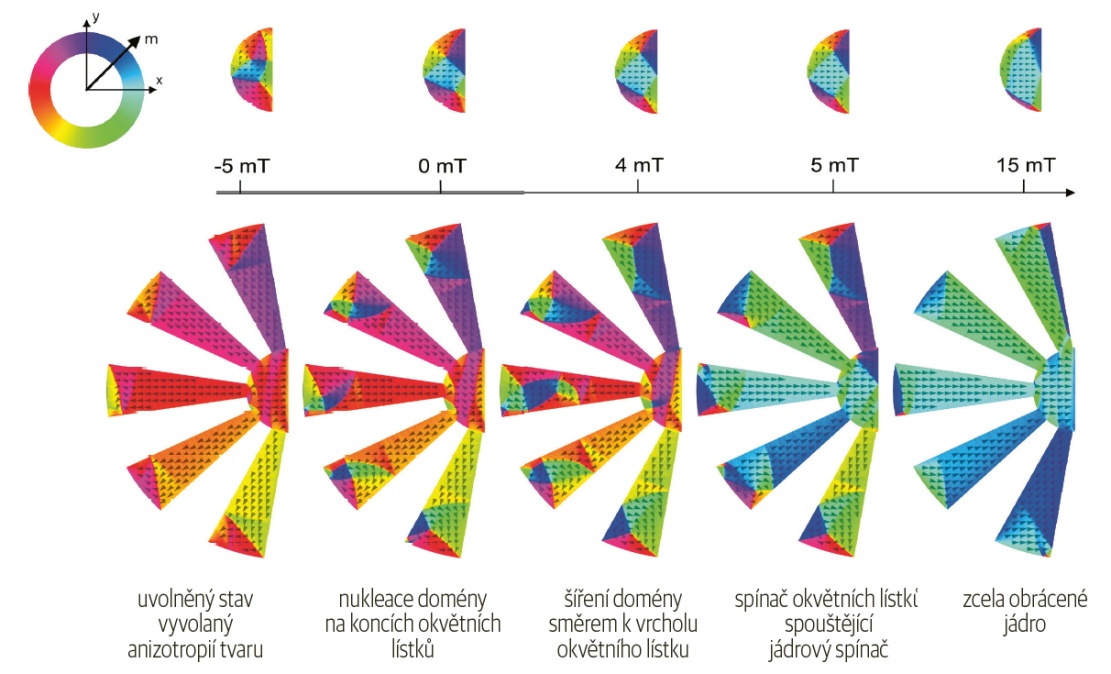 Mikromagnetické simulace znázorňující mechanismy řídící koncentraci magnetického pole v metapovrchu s 10 okvětními lístky R0 / Ri 3,5. Pro přehlednost je zobrazena pouze levá část zařízení (pravá část je v podstatě zrcadlovou verzí distribuce domén). Horní panely odpovídají distribuci magnetických domén v MFC bez okvětních lístků, slouží jako reference a umožňují nám pochopit mechanismy fungující v přítomnosti okvětních lístků (spodní panely). Velikost aplikovaného pole odpovídá projekci podél osy X © ACS Nano 2025