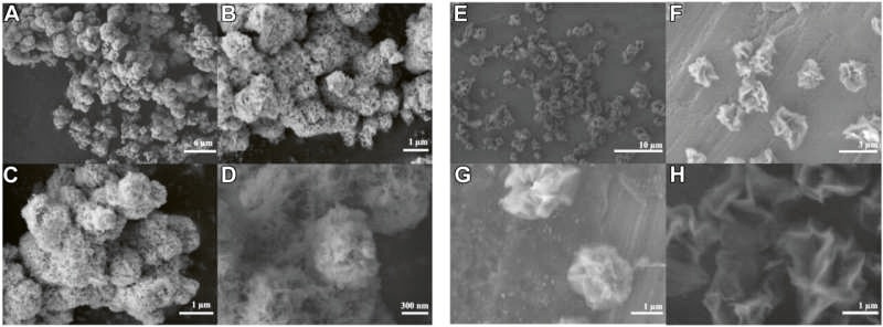 SEM snímky nanokvětů MoS2 (vlevo) a MoSe2 (vpravo) (snímky ve zvětšení od 3 000× (A) po 50 000× (D) pro MoS2 a od 2 700× (E) po 20 000× (H) pro MoSe2). Každý typ NF vykazuje charakteristický rýhovaný povrch, který mu umožňuje velmi vysoký poměr povrchu k objemu